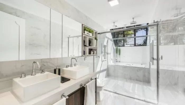 02 chambres avec placards, 1 suite avec cabine de douche en verre, salon, salle de bain avec cabine de douche en verre, cuisine avec placards, parking pour 2 voitures Env. 110m².